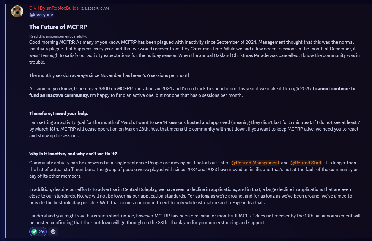 The possibility of a community shutdown had been looming around the staff team since December, but this was no more than just a distant possibility at the time. At the end of February, in Dylan's monthly staff announcement discussing session logs and other factors, he announced that the shutdown possibility would be announced to the community before the end of March 1. On March 1 at 9:10 am, Dylan made an announcement to whitelisted members, titled "The Future of MCFRP". In this announcement, Dylan explained reasoning for shutting down the community, and proclaimed that the community would be shut down on March 28 if 14 sessions weren't hosted before that date. If 7 weren't hosted before March 18, the server would enter the shutdown phase.